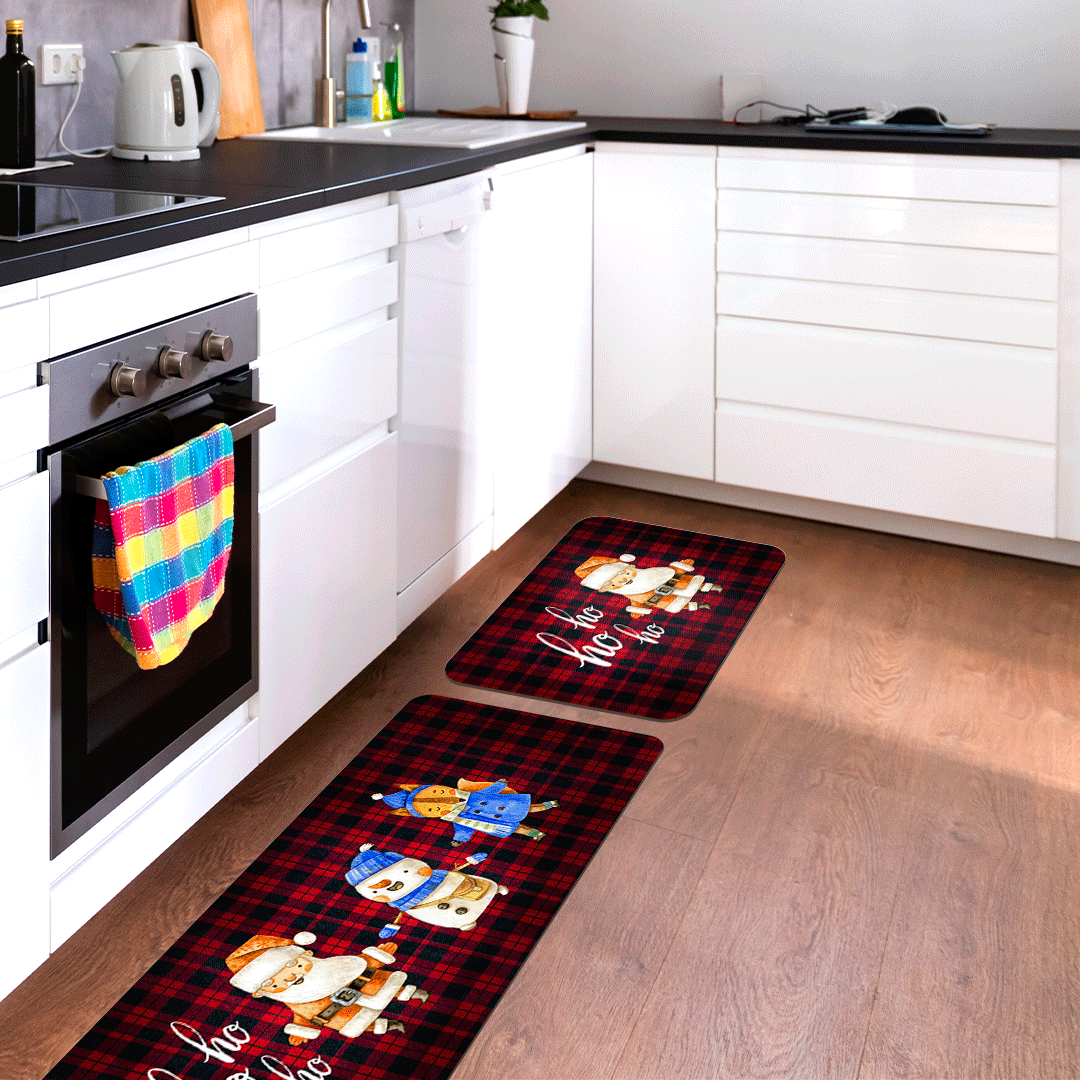 - Cozinha: Coloque um tapete de Natal na cozinha, em frente à pia ou ao balcão, para adicionar um toque de alegria natalina enquanto você prepara refeições festivas.